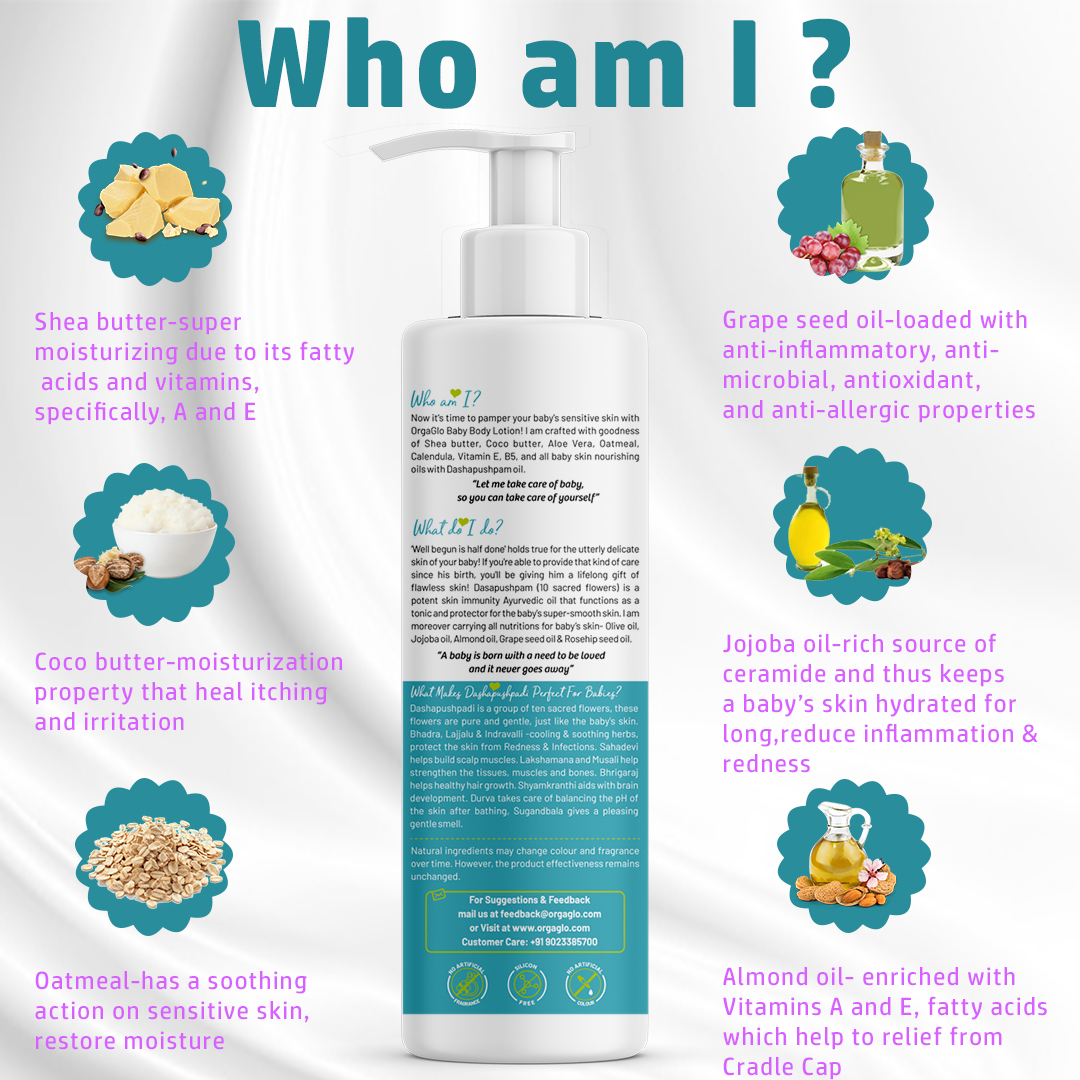 Now it’s time to pamper your baby’s sensitive skin with OrgaGlo natural Baby Body Lotion! I am crafted with goodness of Shea butter, Coco butter, Aloe Vera, Oatmeal, Calendula, Vitamin E, B5, and all baby skin nourishing oils with Dashapushpam oil.