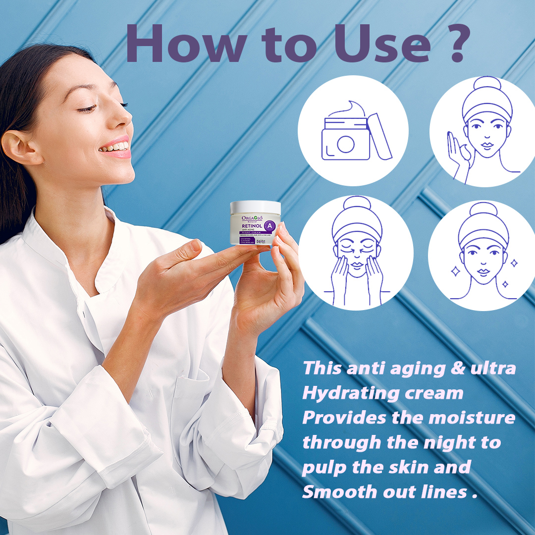 Say Goodbye to wrinkles! Hello, to Orgaglo Retinol night cream!! Yes, I am Orgaglo Retinol Anti-Ageing Night Cream carried with the most transformational ingredients known for skin care. Retinol is a gold standard in anti-ageing skin care. It works on enlarged pores reduces Acne, Improves skin firmness and fights wrinkles. It improves skin health and skin positivity and it's affordable. Retinol Anti-Ageing Night Cream is beginner friendly and great for daily use. With Retinol Anti-Ageing Night Cream, a combination of right strength and regular use is what makes your skin look and feel younger. An early start has long term benefits. This cream has a blend of beneficial nature oriented ingredients Peptides, Niacinamide, Hyaluronic acid, Bakuchi oil, Coconut Oil, Aloe Vera, Almond Oil, Olive Oil, Jojoba Oil, Chia Seed Oil & Wheatgerm oil that increase skin cell turnover, neutralize free radical damage and improve skin firmness. Including this cream in your daily night skincare routine, helps to reduce the appearance of enlarged pores, wrinkles, dullness and uneven skin tone.