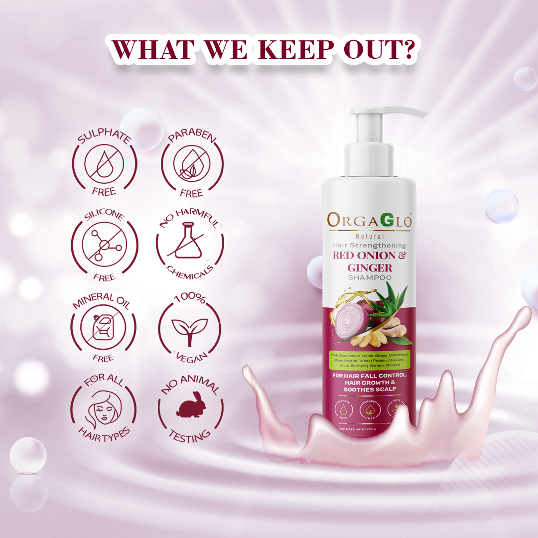 Red Onion Ginger Shampoo - I am Hair Strengthening OrgaGlo Red Onion Ginger Shampoo, specially formulated with the goodness of Red Onion, Ginger, D-Panthenol, Plant Keratin, Wheat Protein, Aloe Vera, Amla, Bhringraj, Brahmi, Shikakai.