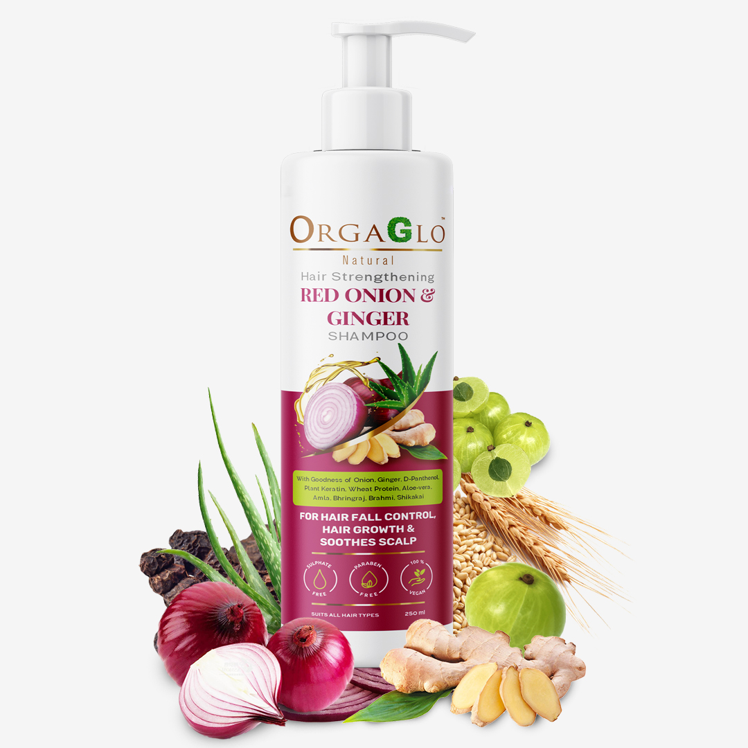There are numerous benefits of Red Onion and Ginger shampoo. OrgaGlo Onion shampoo is enriched with Onion, Ginger, Amla, Bhringraj, Brahmi, Shikakai and Aloe Vera. Regular use of shampoo helps to stimulate hair development, fight hair fall, prevent dandruff, control premature graying and make your hair healthy, strong and shiny.