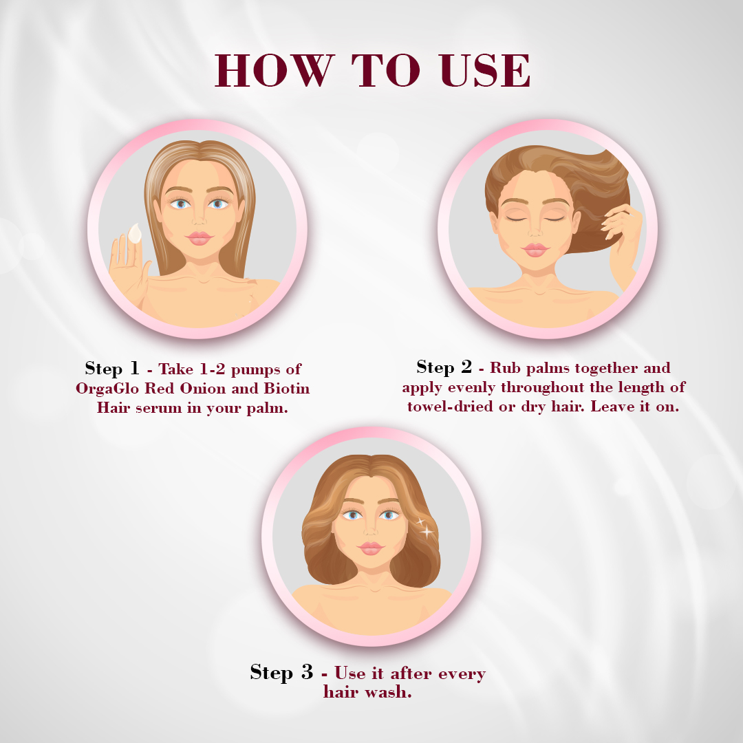 Take 1-2 pumps of OrgaGlo Red Onion Hair serum in your palms, depending on your hair length. Rub palms together and apply evenly throughout the lengths of towel-dried or dry hair, all the way to the hair tips. Turn it on. Use it after every hair wash with OrgaGlo Red Onion shampoo and conditioner for optimum results.