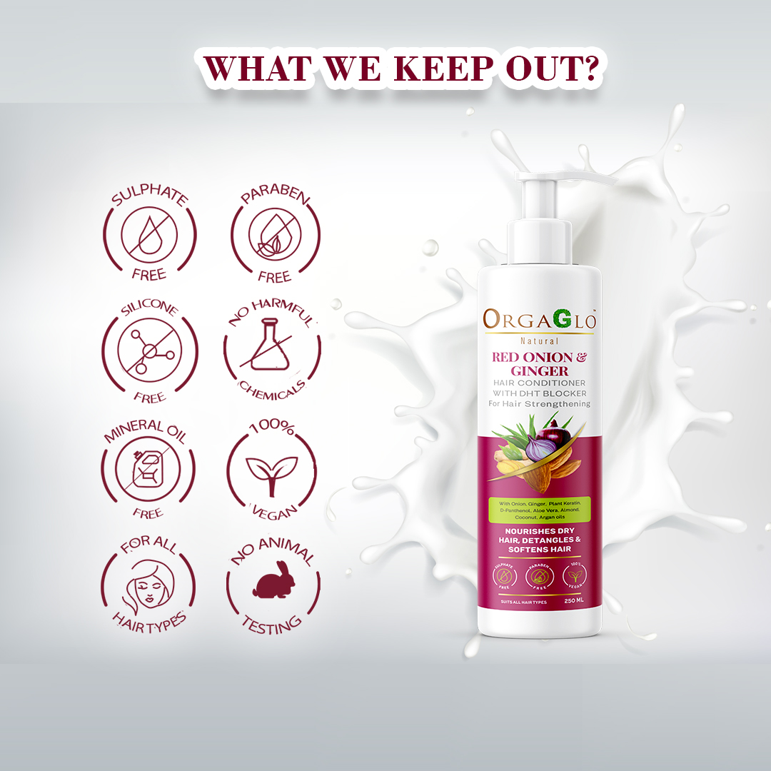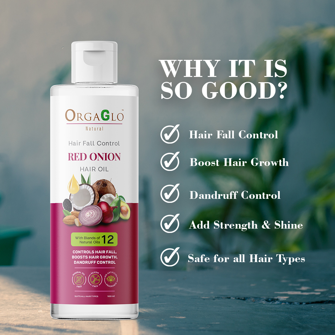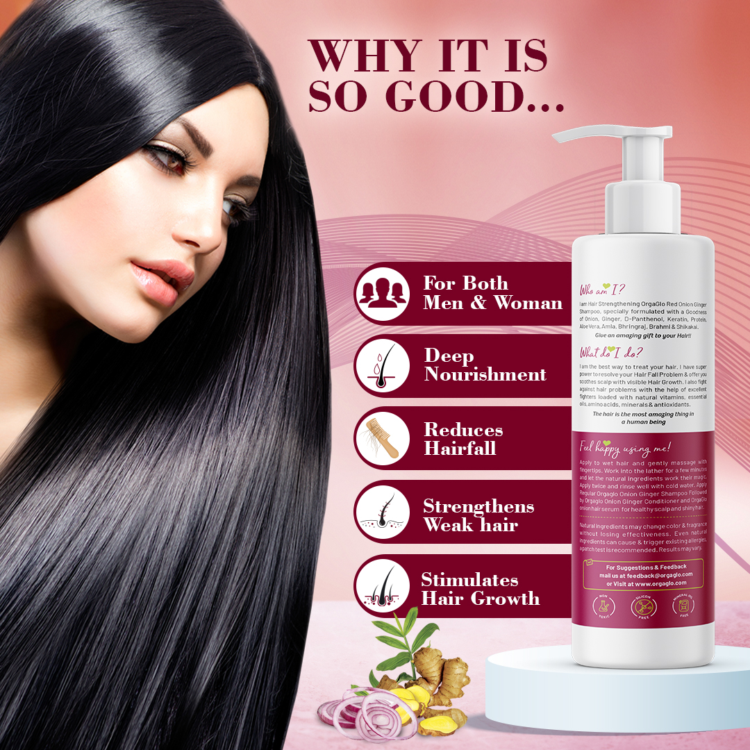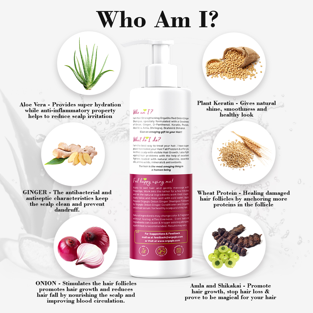 I am Hair Strengthening OrgaGlo Red Onion complete hair care combo, specially formulated with the goodness of Red Onion, Ginger, D-Panthenol, Plant Keratin, Wheat Protein, Aloe Vera, Amla, Bhringraj, Brahmi, Shikakai, Sweet Almond Oil, Biotin, Olive oil, Hibiscus and many more hair strengthening actives.