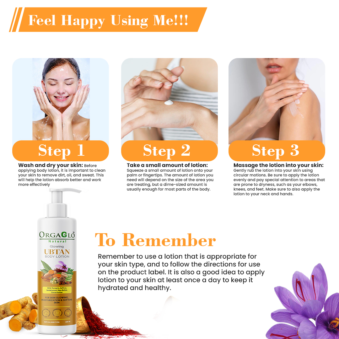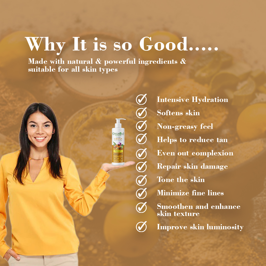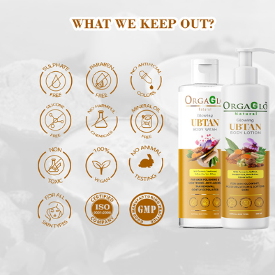 OrgaGlo Ubtan Body Lotion packed with natural brightening ingredients like Turmeric & Saffron which brighten up your skin. While Shea butter, Cocoa butter, Olive oil, Jojoba oil, Almond oil, Aloe Vera, Glycerin and Vitamin E, deeply moisturize the skin and give soft, supple and smooth skin. This Lotion makes your skin soft not sticky.