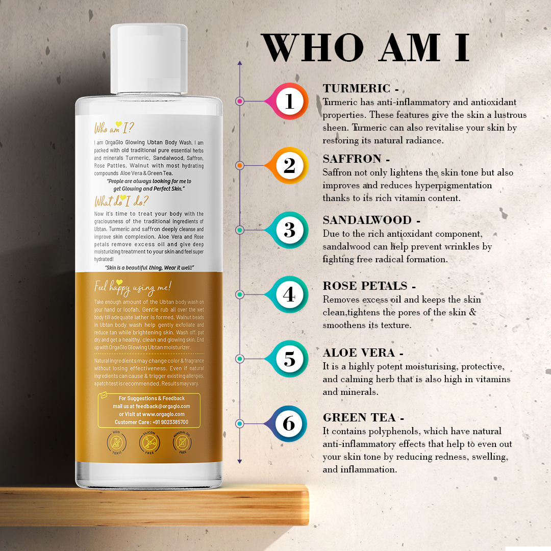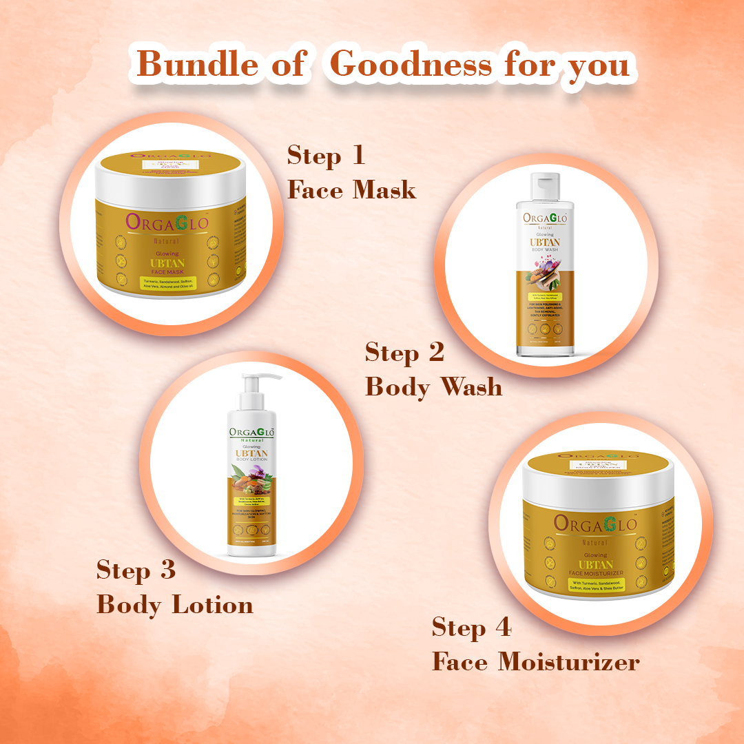 I am OrgaGlo Natural Glowing Ubtan Gental Care Combo. I am packed with old traditional pure essential herbs and minerals like Haldi (Turmeric), Chandan (Sandalwood), Kesar (Saffron), Rose Petals, Walnut with most hydrating compounds Aloe Vera & Green Tea.