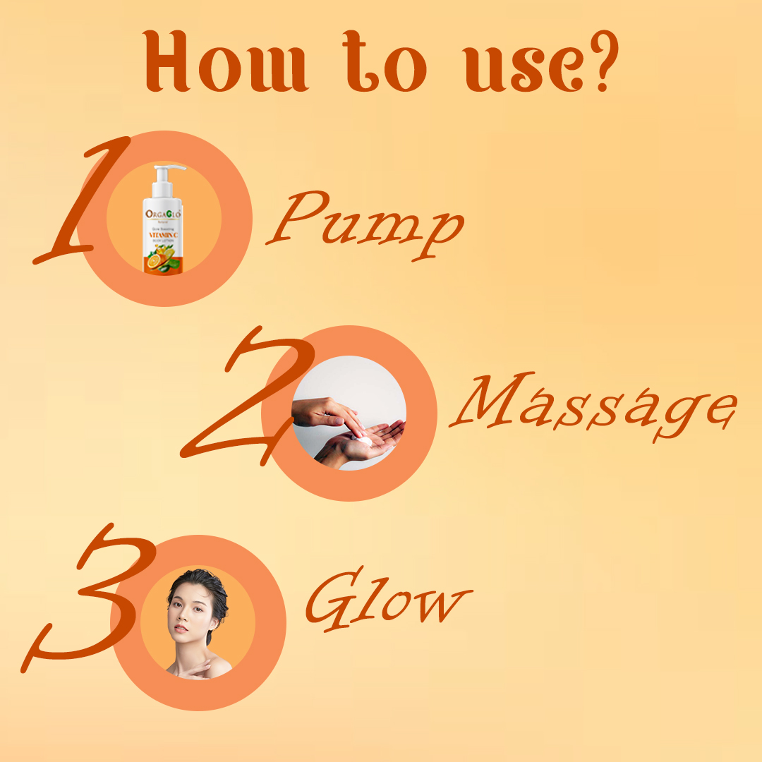 Pump out an adequate amount of OrgaGlo Vitamin C brightening body lotion on your palm. Gently massage the lotion all over your body until completely absorbed. For best results use it daily or when your skin needs moisturization.