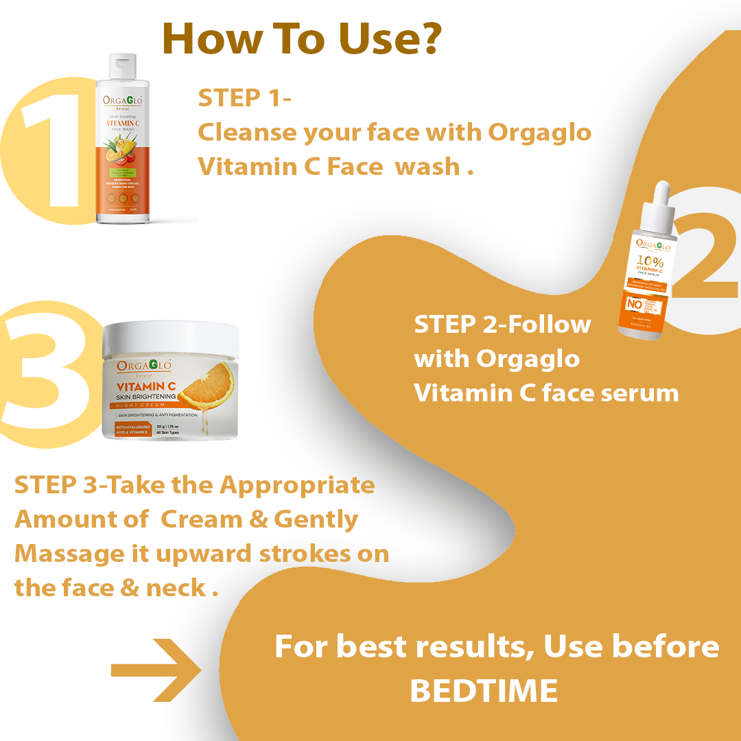 We recommend that you incorporate OrgaGlo natural Vitamin C night cream and face serum into your daily skin care routine. For better results use once at night before going to bed.