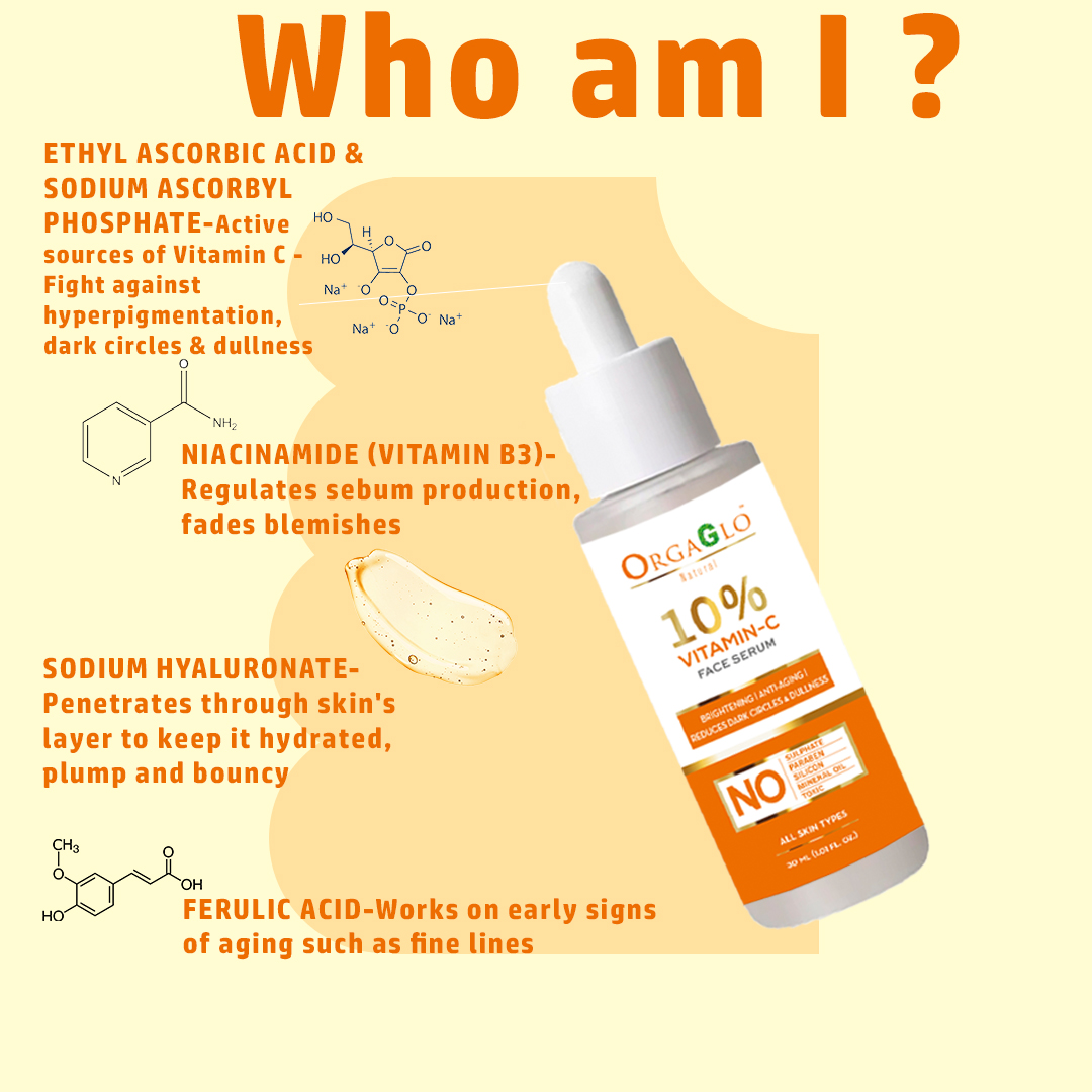 I am OrgaGlo Natural Brightening & Anti-Aging 10% Vitamin C face serum infused with pure Vitamin C, powerful antioxidant Ferulic acid, hydrating agents Hyaluroic acid, Aloe Vera, Zinc PCA and Niacinamide.